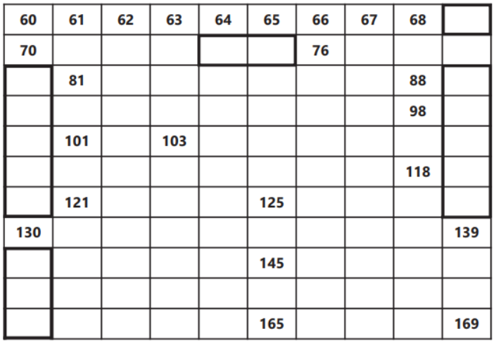 El siguiente cuadro tiene escrito algunos números ordenados desde el 60 al 169. Completá solamente los casilleros marcados.![]() |