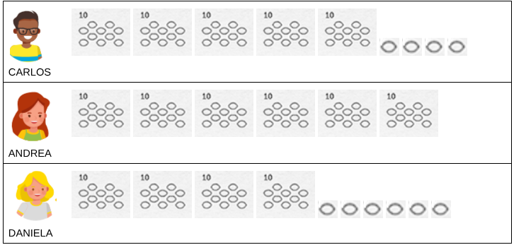 ¿CUÁNTAS PIEDRITAS TIENE CADA UNO? ¿CUÁNTAS PIEDRITAS LE FALTAN A CARLOS PARA TENER LA MISMA CANTIDAD QUE ANDREA? ¿CUÁNTAS PIEDRITAS TIENEN CARLOS Y DANIELA JUNTOS? ¿CUÁNTOS MONTONCITOS DE 10 SE PUEDEN HACER SI JUNTAN LAS PIEDRITAS LOS TRES? |