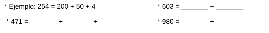 7. La tecla rota. En la calculadora no funciona la tecla del 7. ¿Cómo harías para escribir el número 375 usando una suma? Escribí una forma posible. *....................................................................................................................................................... 8. Descubrí la regla. En esta serie, los números van cambiando siguiendo un secreto. ¡Descubrilo y completá los casilleros que faltan! 245 - 345 - 445 - ............ - ............ - 745 a) ¿Cuál es el secreto o la regla de esta serie? Respuesta: ............................................................................................................... 9. Una pregunta para pensar. Ana dice que el número 812 es más grande que el 182 "porque el 8 vale más al principio". ¿Estás de acuerdo? ¿Por qué? Respuesta: .................................................................................................................................................................... |