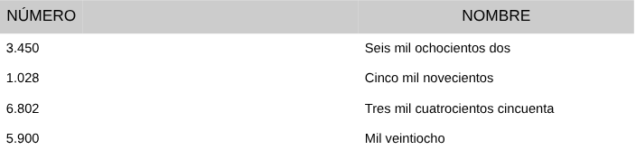 10. Unir con flechas. Uní cada número con su nombre escrito.![]() 11. Desarmando números. Escribí las sumas que forman estos números, como en el ejemplo. * Ejemplo: 2.543 = 2.000 + 500 + 40 + 3 * 4.718 = ___________ + _______ + _______ + _______ * 6.035 = ___________ + _______ + _______ * 9.800 = ___________ + _______ 12. El anterior y el siguiente. Completá los casilleros vacíos de este cuadro. ![]() |