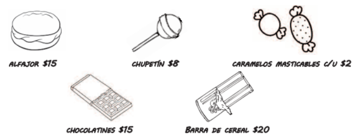 a- ¿Qué podríamos comprar con $25? b- ¿Cuánto debemos pagar si compramos un alfajor y dos barras de cereal? c- Cecilia gastó $50 y no le dieron vuelto ¿qué pudo haber comprado? d- José tiene que comprar 10 alfajores. si tiene $160 ¿Le falta o le sobra dinero? ¿Cuánto? |