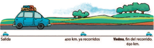 1. ¡Carrera de autos! El auto A salió y avanzó 200 metros, el auto B va más adelante y ya avanzó 300 metros. ¿Por cuántos metros le va ganado el auto B al auto A?![]() 2. La ruta entre la ciudad de Neuquén y la ciudad de Viedma es de 650 kilómetros. Un auto salió de Neuquén para ir hacia viedma y ya recorrió 400 kilómetros, ¿cuántos kilómetros faltan recorrer para llegar?