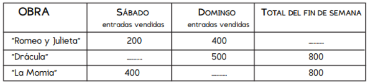 Más problemas para resolver 1. Sofía compró algunos alimentos para el comedor de la escuela. Llevó $1000 y gastó 500 en la verdulería y 300 en la panadería. ¿Cuánto dinero le sobró? 2. ¿Cuánto dinero recibió la cooperadora de la escuela este mes si tenía $600 y luego de juntar la recaudación tienen $1000? 3. En 4º grado hay 20 alumnos. Algunos se quedan a comer en la escuela y otros se van a su casa al mediodía. Se quedan a comer 15, ¿cuántos son los que se van a su casa al mediodía? 4. En la boletería del teatro se completó el siguiente cuadro para saber la cantidad de entradas que se vendieron cada día para cada espectáculo. Le faltan algunos datos, completalo. ![]() |