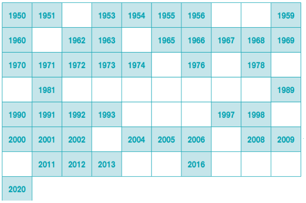 En este cuadro hay números ordenados desde el 1950 hasta el 2020. ¿Se animan a completarlo? Hay que llenar los casilleros blancos.