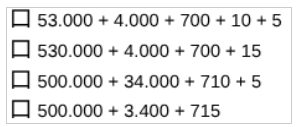 Numeración: Composición y descomposición - Análisis de datos1) ¿Cuáles de estas sumas permiten obtener 534.715? Hacé una cruz en la casilla (口) a las que correspondan 2) Países y números para armar Acá están algunos países de América del Sur y la cantidad de habitantes escrita en sumas y multiplicaciones. Volvé a escribir el número según el resultado de cada operación. Ahora escribí de manera aditiva o multiplicativa el número de habitantes de Bolivia y Paraguay Bolivia: 12.079.472 habitantes (datos de 2024) Paraguay: 7.133.000 habitantes (datos de 2022) 3) Provincias y habitantes Esta tabla muestra datos de la población de algunas provincias argentinas según el Censo Nacional realizado en 2022. En el gráfico de barras se representa, aproximadamente, la cantidad de habitantes de cada provincia. ¿Qué barra corresponde a cada una? Escribir el número |