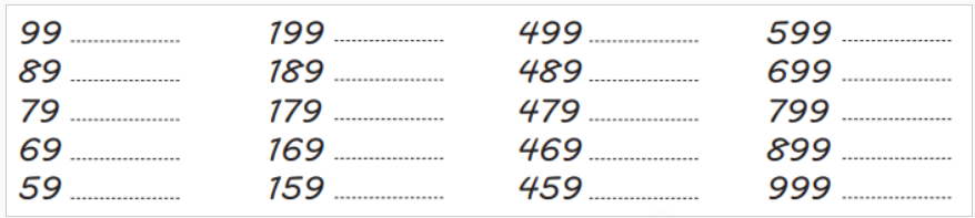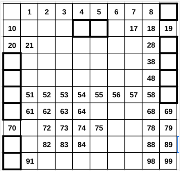 1. El siguiente cuadro tiene escrito algunos números ordenados desde el 1 al 99. Completá los casilleros marcados y todos los que terminan en 5.