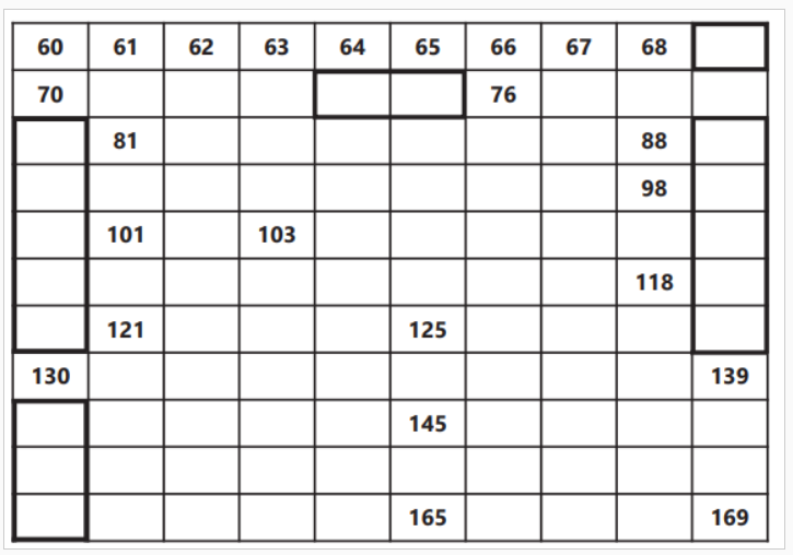 1. El siguiente cuadro tiene escrito algunos números ordenados desde el 60 al 169. Completá solamente los casilleros marcados.