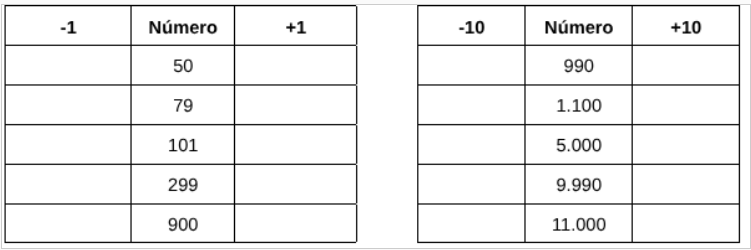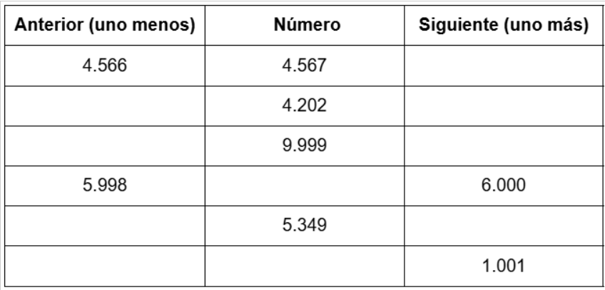 1. Completá el cuadro anotando el número anterior y el número siguiente a los números de la columna del medio. 2. Decidir cuál es el número siguiente a otro a veces no es tan fácil. ¿Cuál es el número siguiente a...?