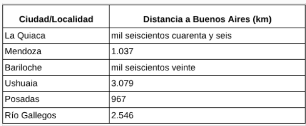 Distancias a Buenos Aires En esta tabla están las distancias de diferentes puntos de Argentina y su distancia a Buenos Aires. Dos de las distancias estarán escritas con letras. Tabla de Distancias a Buenos Aires