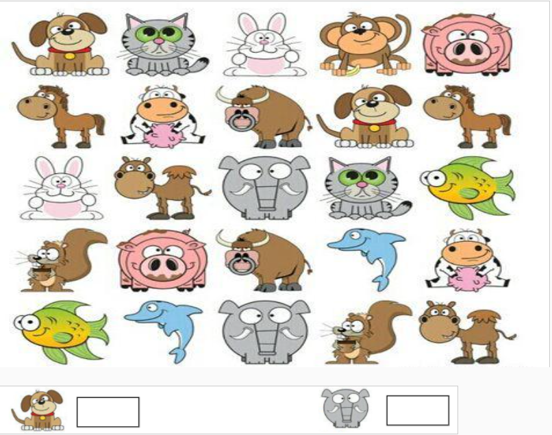 2- CUENTO LA CANTIDAD DE PERROS Y ELEFANTES QUE HAY , COLOCO EL NÚMERO QUE CORRESPONDE.