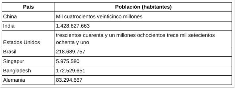 Población de Países del MundoEn la siguiente tabla están las poblaciones estimadas de algunos países. Hay dos escritos en letras. Tabla de Población Mundial (Estimado)
