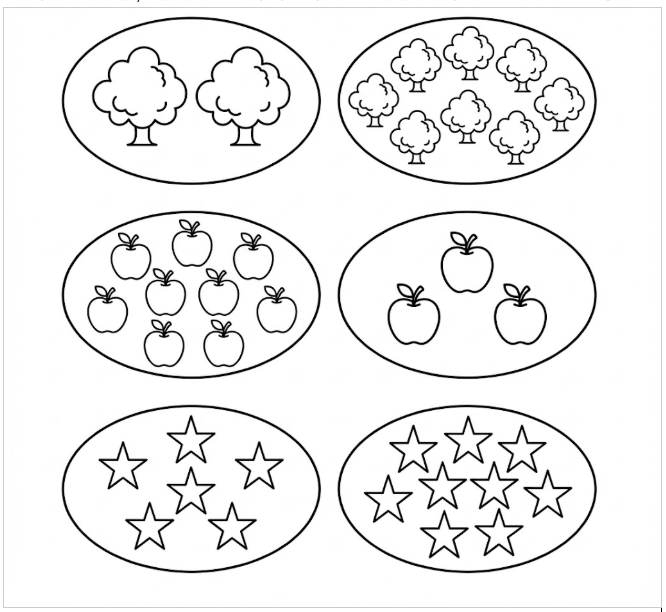 Numeración: Comparación de cantidades (Hasta 10)EN CADA PAR, PINTÁ DE ROJO DONDE HAY MÁS Y DE VERDE DONDE HAY MENOS. |