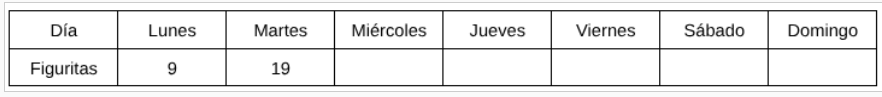 1. Juana pega 10 figuritas por día en su álbum. El lunes había pegado 9. Completá la tabla para saber cuántas figuritas tendrá pegadas el domingo. El martes va como ayuda.